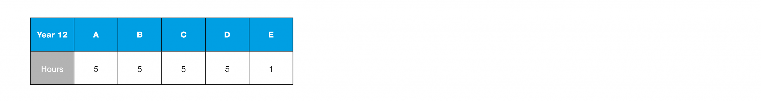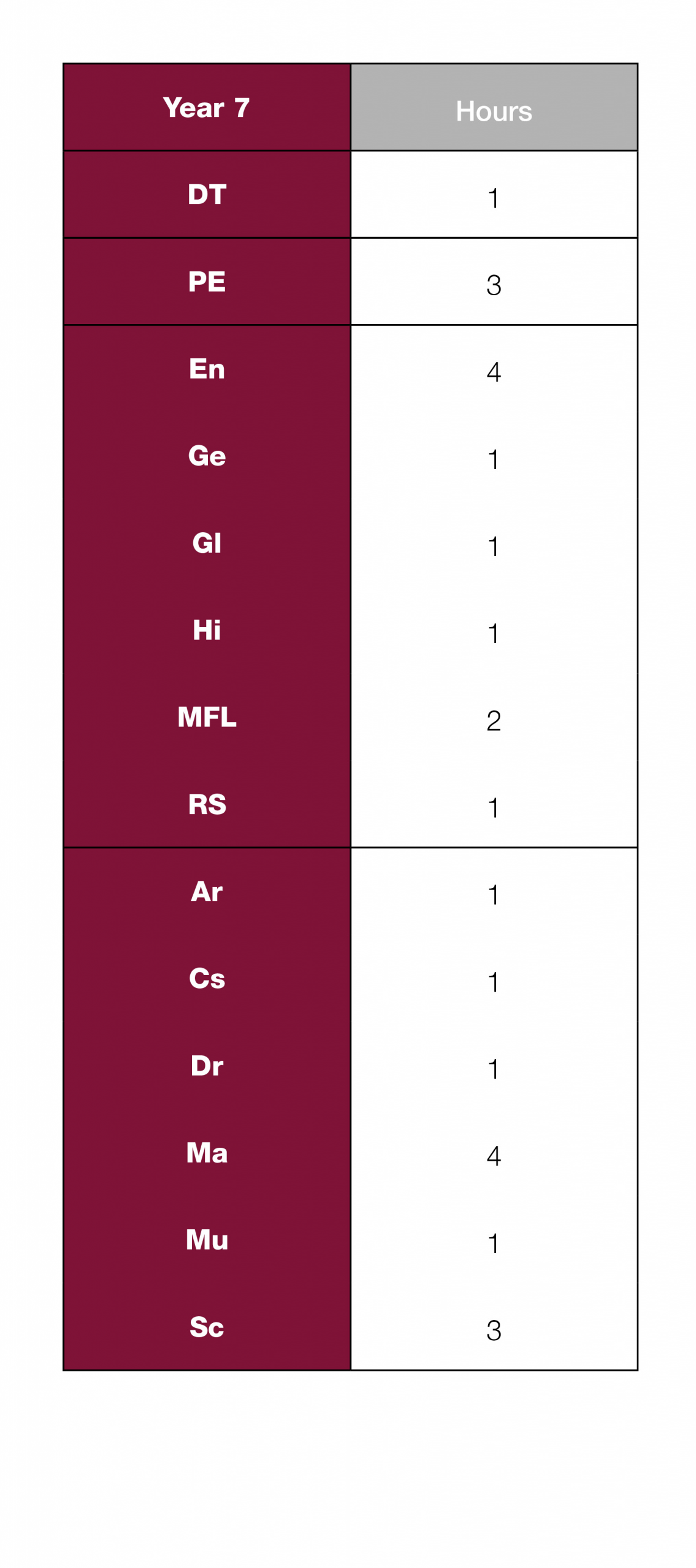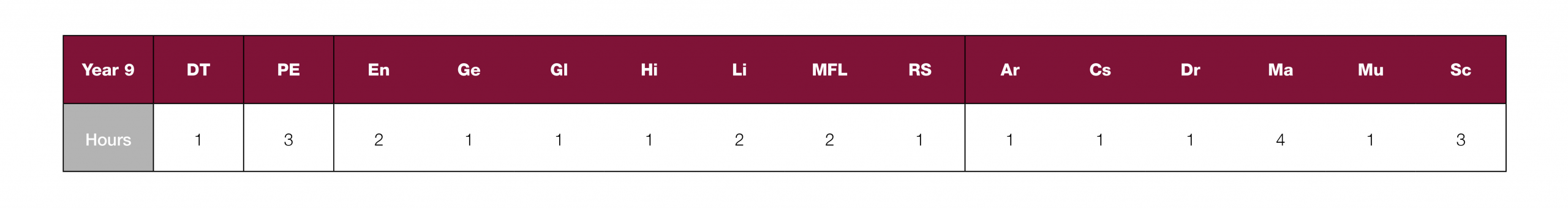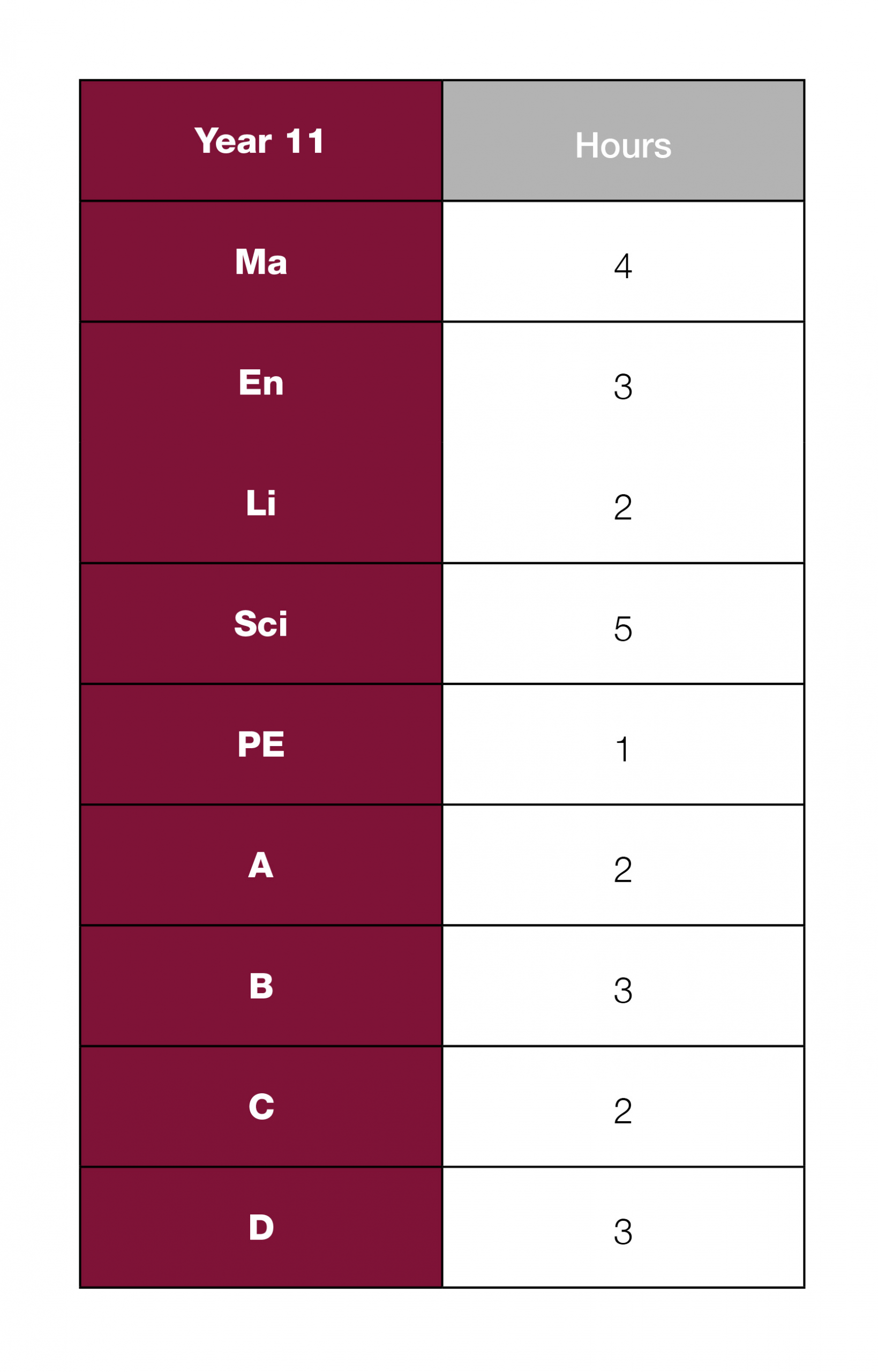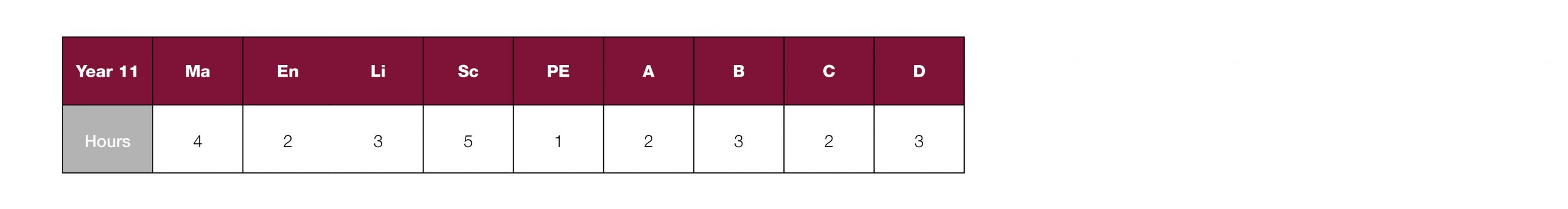 The table shows the number of hours allocated to each subject per week.