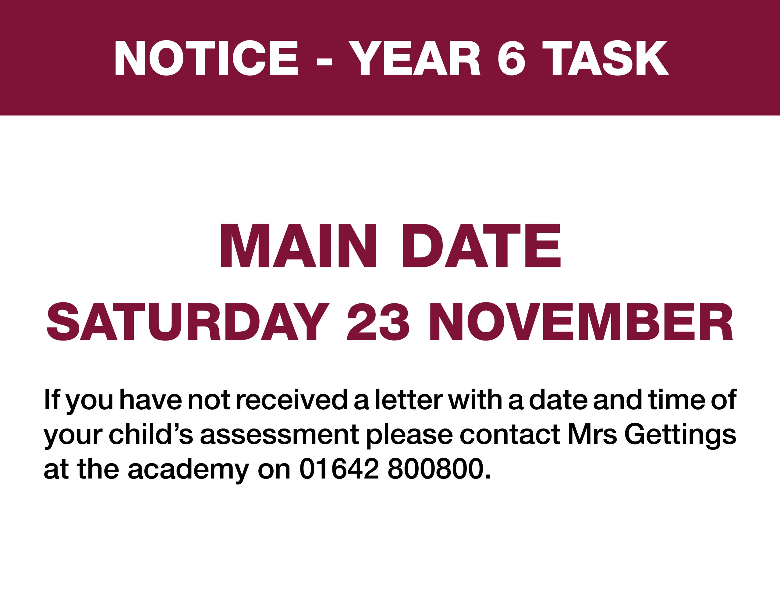 Main Date Saturday 23 November. If you have not received a letter with a date and time of your child’s assessment please contact Mrs Gettings at the academy on 01642 800800.
